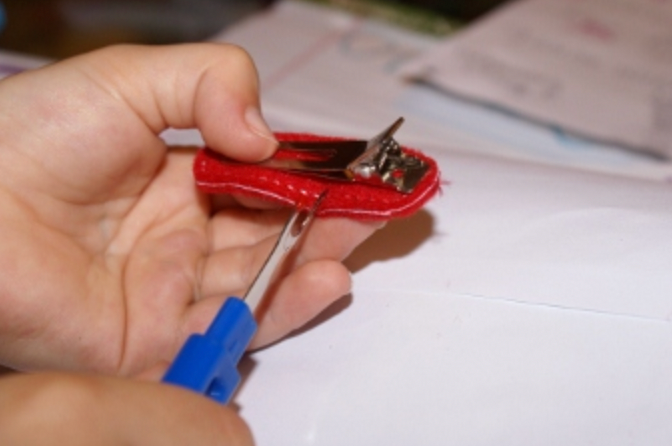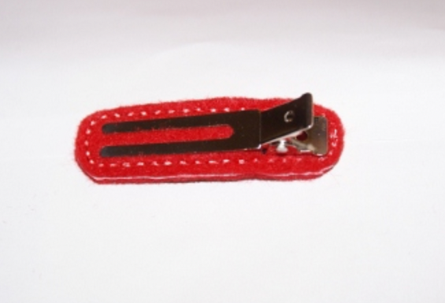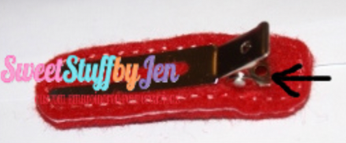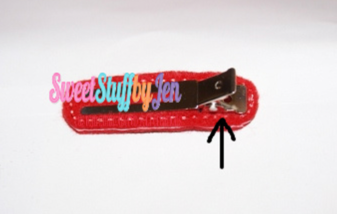 IF you want, put a tiny drop of glue inside the pocket. It keeps the clip from slipping out or moving around. All finished!! You are now ready to glue on your feltie!! These instructions are owned by SweetStuffbyJen.com any copies of these instructions are prohibited.
